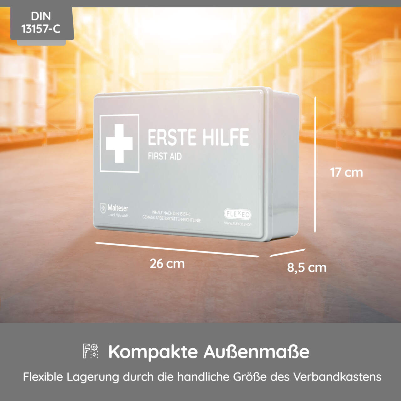 Der Betriebsverbandkasten von FLEXEO ist ideal für Unternehmen, öffentliche Einrichtungen und private Haushalte geeignet. Die Füllung vom Verbandskasten umfasst alle Verbandsmaterialien, die nach der aktuellen DIN-Norm 13157 und den Unfallverhütungsvorschriften in Betrieben vorgehalten werden müssen. Er eignet sich als Notfallkoffer für Arbeitsstätten der Verwaltung und Handelsbetrieben mit bis zu 50 Beschäftigten, Betriebe der Herstellung mit bis zu 20 Beschäftigten und Baustellen mit bis zu 10 Beschäftigten. Der Verbandkasten besteht aus bruchsicherem und schlagfestem Kunststoff.