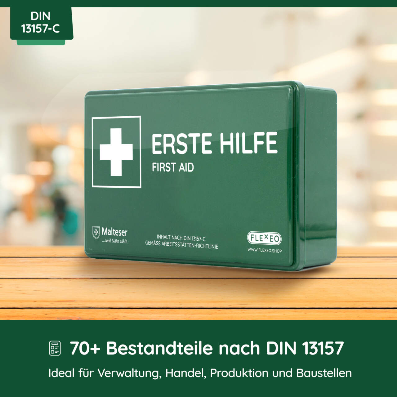 Der Betriebsverbandkasten von FLEXEO ist ideal für Unternehmen, öffentliche Einrichtungen und private Haushalte geeignet. Die Füllung vom Verbandskasten umfasst alle Verbandsmaterialien, die nach der aktuellen DIN-Norm 13157 und den Unfallverhütungsvorschriften in Betrieben vorgehalten werden müssen. Er eignet sich als Notfallkoffer für Arbeitsstätten der Verwaltung und Handelsbetrieben mit bis zu 50 Beschäftigten, Betriebe der Herstellung mit bis zu 20 Beschäftigten und Baustellen mit bis zu 10 Beschäftigten. Der Verbandkasten besteht aus bruchsicherem und schlagfestem Kunststoff.