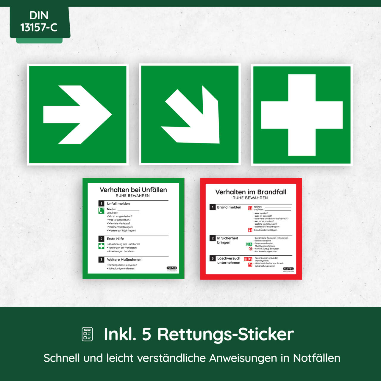 - 5 × Sticker (Richtungspfeile, Notfall-Aushang)