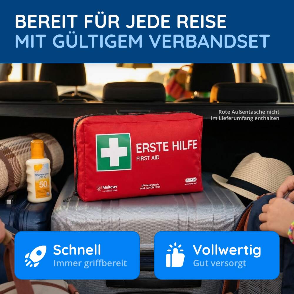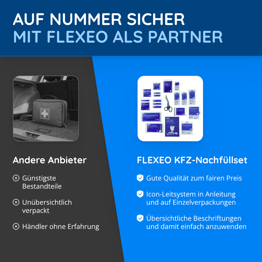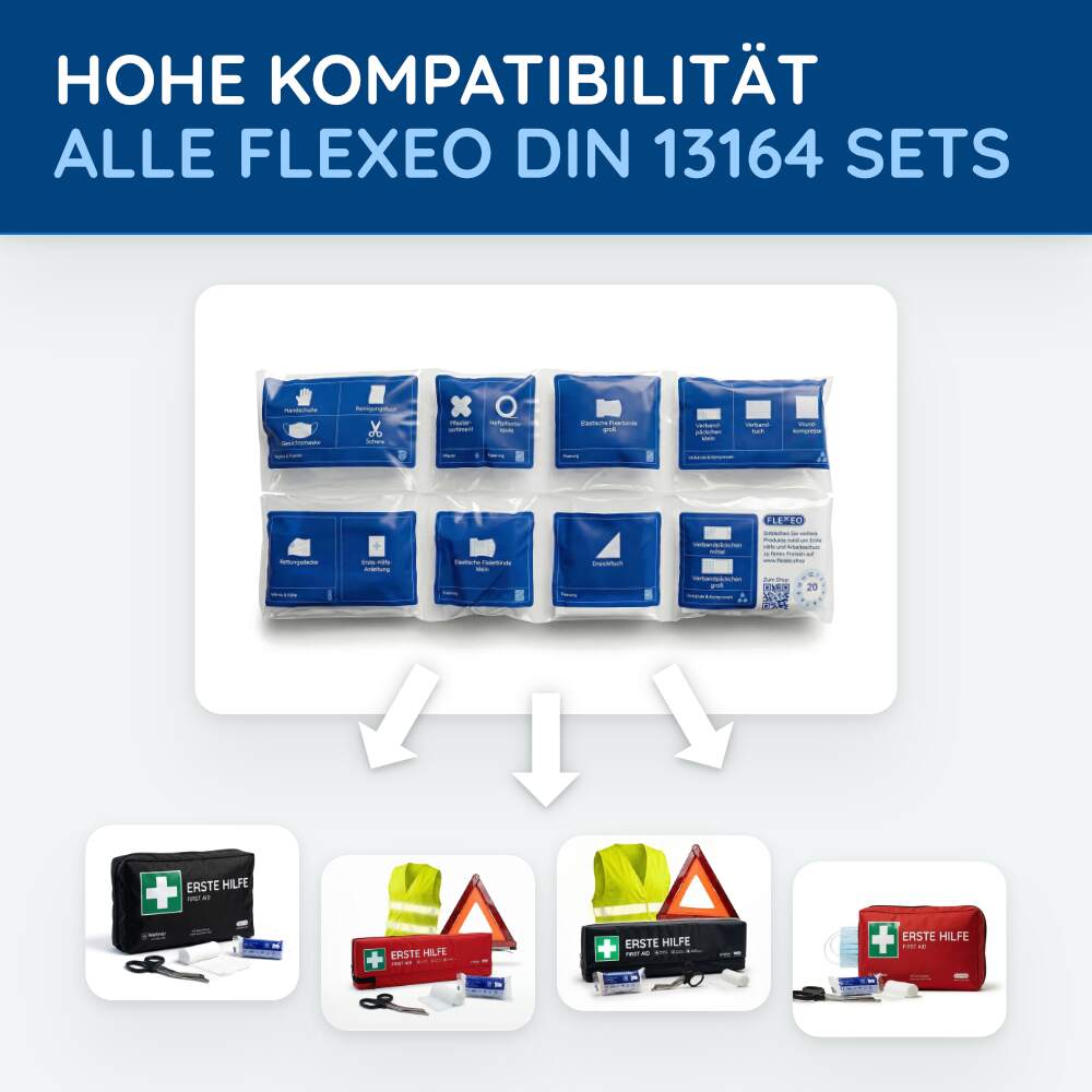 DIN 13164:2022-konform: Das FLEXEO KFZ-Nachfüllset erfüllt die aktuellen Normen und Richtlinien gemäß der DIN 13164:2022. Diese Norm legt die Mindestanforderungen für Verbandsmaterialien in Kraftfahrzeugen fest und garantiert somit eine hohe Qualität und Sicherheit.